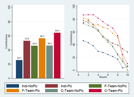 Figure 2 provides an overview of the experimental results. The left panel shows the average contributions across all rounds and the right panel shows the average contributions over time. The first two bars in the left panel show the contributions when the game was played by individuals, either anonymously (Indi-NoPic) or with identification (Indi-Pic). We see that, when identities are revealed, players on average contribute more than twice as much than when identities are kept private. The right panel shows that the difference between Indi-NoPic and Indi-Pic exists in the first round already and remains relatively stable throughout the game. The other bars in the left panel of Figure 2 show the average contributions of the teams. F-Teams are the teams that communicated face to face and C-Teams are the teams that communicated via computer chat. NoPic and Pic indicate again whether the game was played anonymously or not. It is easy to see that teams contribute more on average than individuals. More importantly, however, the results show that identification has a much smaller effect on teams than on individuals and indeed the differences between F-Team-NoPic and F-Team-Pic and between C-Team-NoPic and C-Team-Pic  are not statistically significant. As can be seen in the right panel, in the last round of the game, there is almost no difference between the anonymous teams and the identified teams.